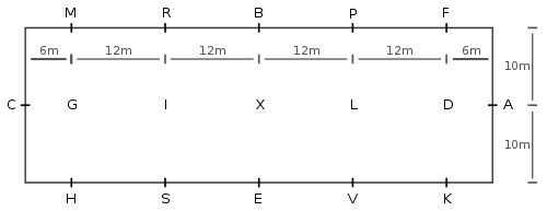Hay dos tamaños de pistas: pequeña de 40x20 m y estándar de 60x20 m. Cada uno tiene letras asignadas a las posiciones alrededor de la arena para especificar donde se realizarán los movimientos. La pista pequeña se utiliza para los niveles más bajos del adiestramiento. Sus letras alrededor del borde exterior, empezando con el punto de la entrada y moviéndose a la derecha, son A-K-E-H-C-M-B-F. Las letras también marcan localizaciones en el centro de la arena: Bajando la línea de centro, son D-X-G, con X en el centro.